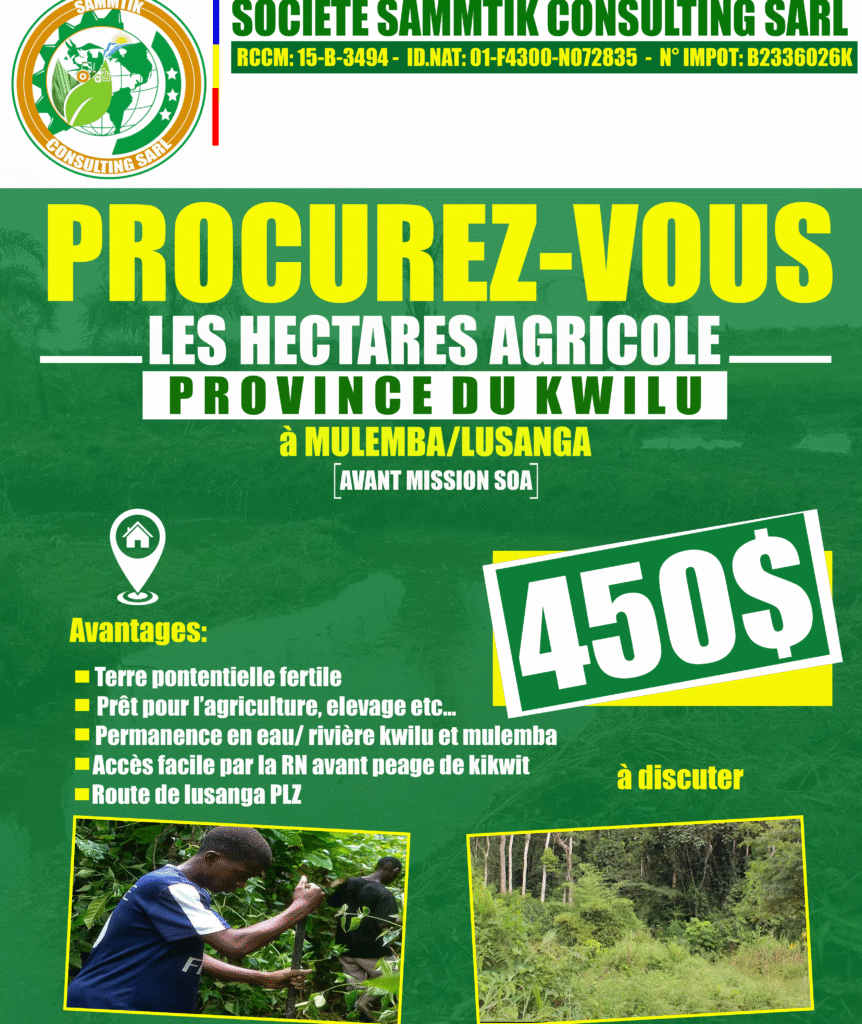 Nous disposons 20 hectares des terrains agricole dans le village MULEMBA avant la mission catholique de Munduli/Soa (LUSANGA PLZ) dans le territoire de Bulungu, province du kwilu.