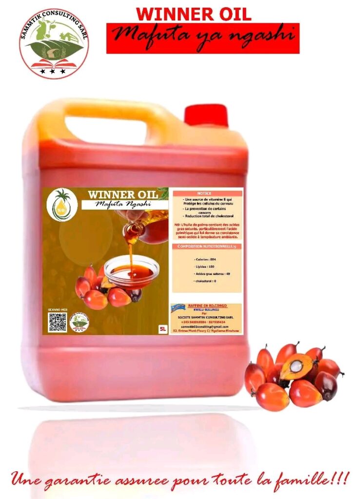 - Winner OIL : Essence pure de la nature, savourez la richesse et l’authenticité de notre huile de palme 100% naturelle, issue des meilleurs plantations de palmier a naines. Idéale pour vos plats traditionnels er modernes, elle sublime vos recettes avec une couleur éclatante, un goût raffiné et une qualité irréprochable dans les marchés locales et international. PRIX: 10$